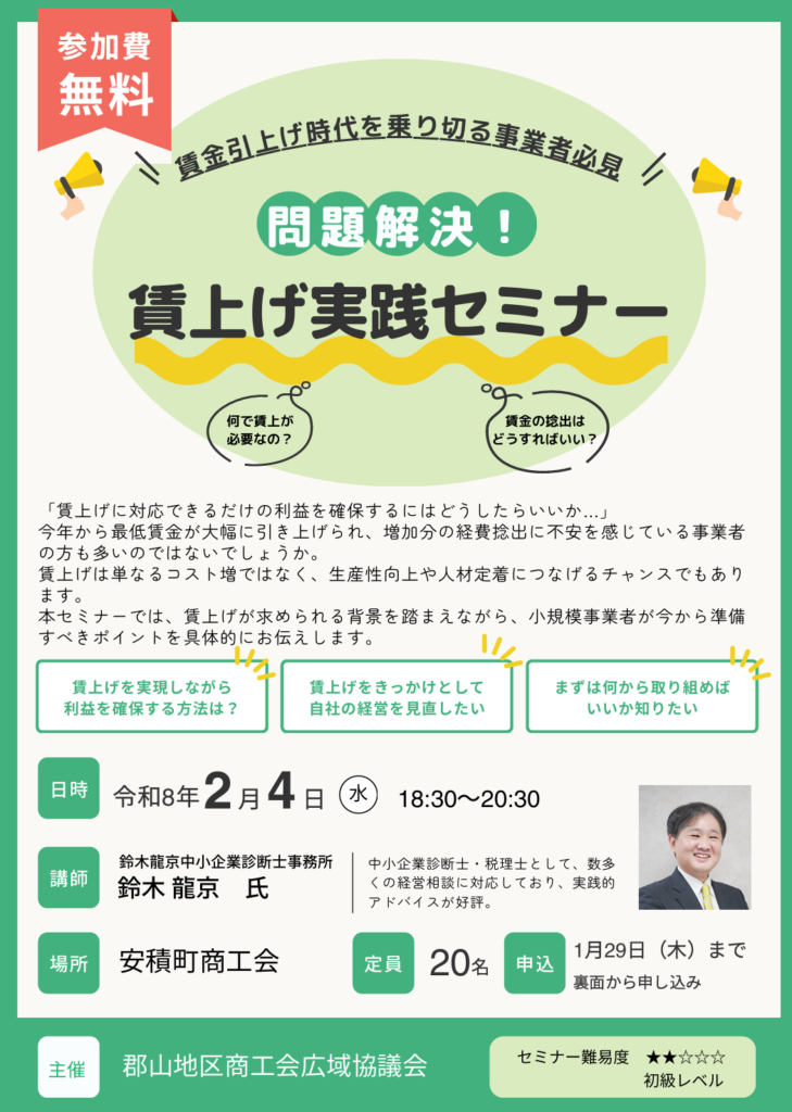 賃上げへの対応や利益確保の考え方を学べる実践的な内容となっています。是非ご参加ください。