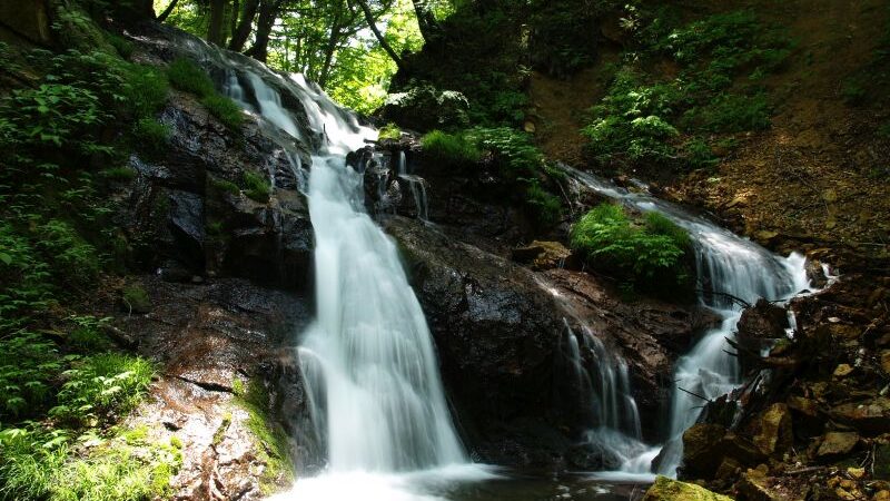 猪苗代湖へとそそぐ菅川の上流に位置する滝で、高さは約7m。隣接する隠津島神社の社叢とともに、新緑や紅葉の名所として知られています。夏には涼を求め、多くの人々が訪れる憩いのスポットです。
